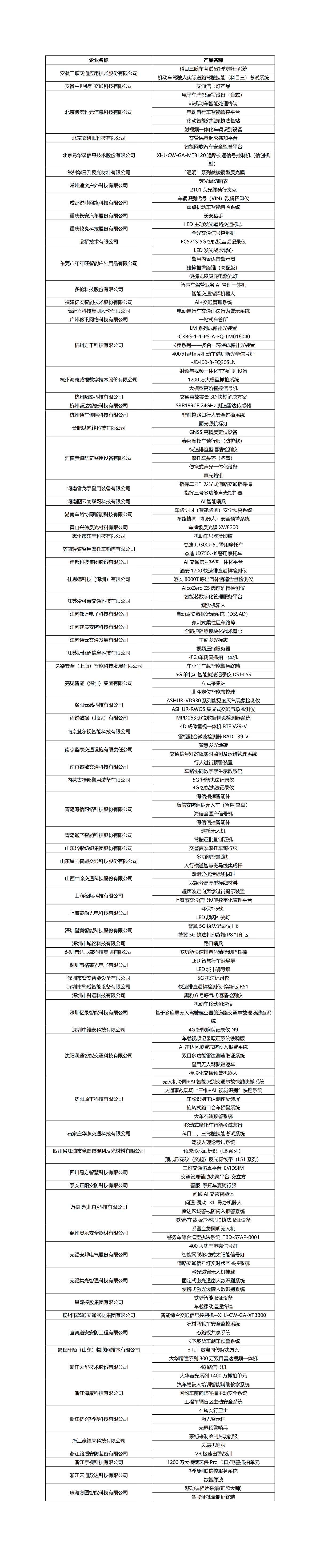 本次《目录》,由91家参展单位报送260件产品,最终82家单位的162件产品入选。产品涵盖道路安全相关的硬件、软件、工程及服务等,涉及七大类别:交通安全设施类、智能交通管理类、交通违法取证类、车辆驾驶人管理类、交通警用装备类、综合信息平台类、工程服务及其他类。