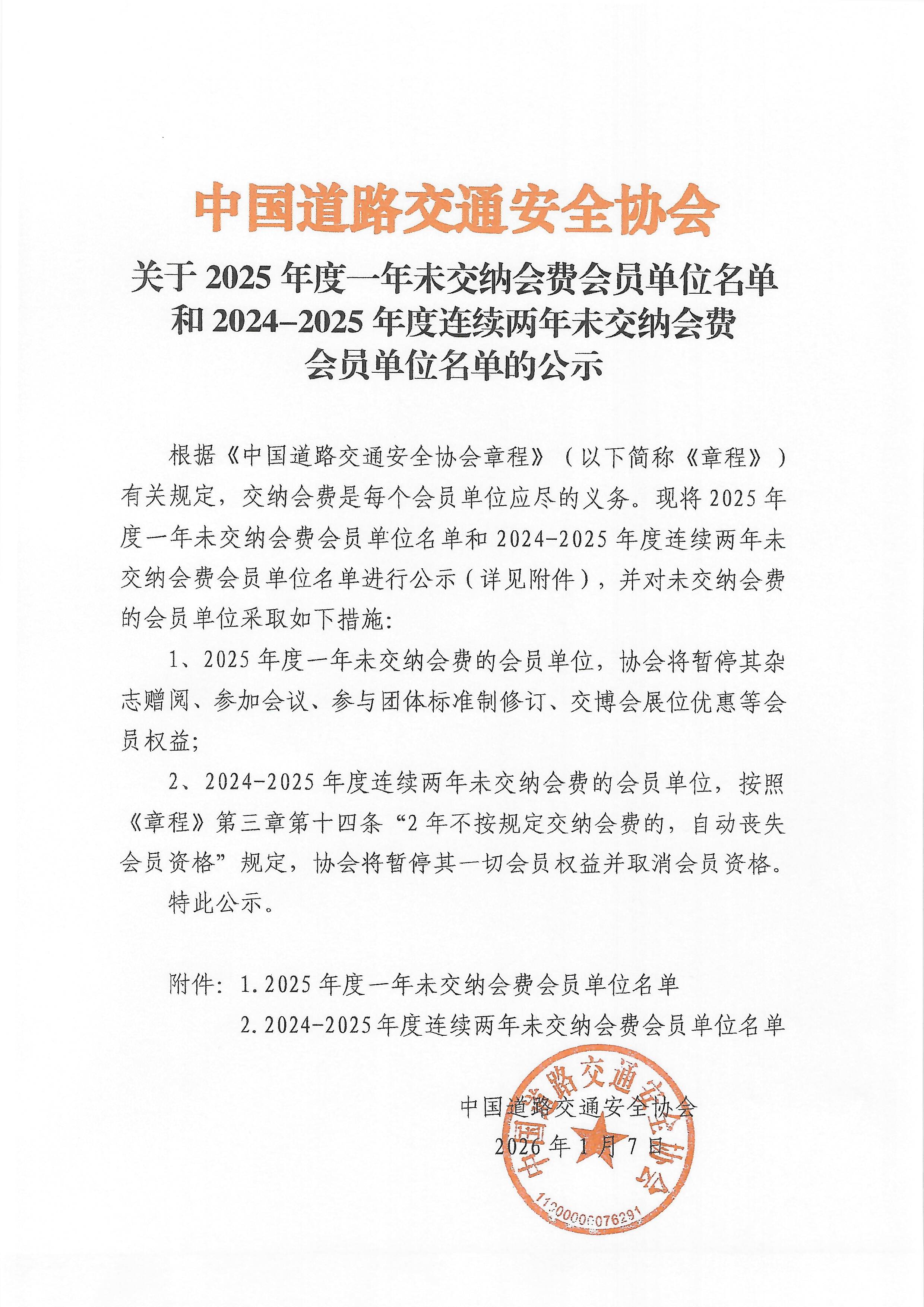 关于2025年度一年未交纳会费会员名单和2024-2025年度连续两年未交纳会费会员名单的公示